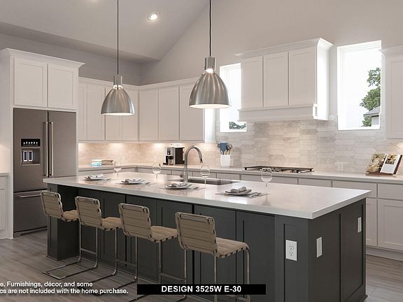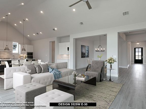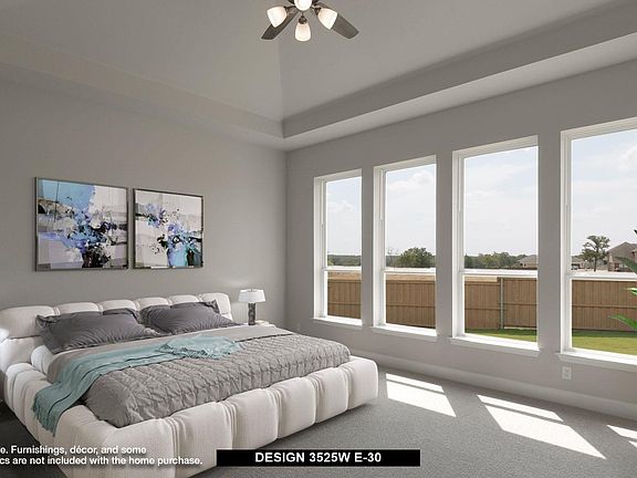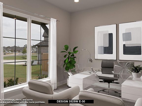 Home office with French doors set at entry. Formal dining room and game room with French doors frame extended entry. Family room with sliding glass door and cast stone fireplace opens to morning area and kitchen. Kitchen hosts island with built-in seating space. Primary suite includes bedroom with wall of windows. Dual vanities, garden tub, separate glass-enclosed shower and large walk-in closet in primary bath. All bedrooms feature private baths. Abundant closet space, high ceilings and large windows add to this generous design. Extended covered backyard patio. Mud room leads to three-car garage.