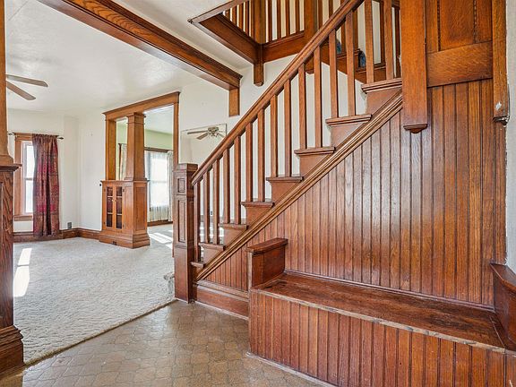 Overflowing with charm and loaded with character. This 2 -story home is a timeless classic boasting original woodwork, high ceilings and an eye-catching open staircase in the inviting front foyer. Beautiful built in cabinets are on display in the living room and carries into the dining room. The kitchen has a nice layout with room for a center island or buffet table. French doors lead to the sunroom/family room that was added in 1992. It could also be used as a main floor bedroom. Main floor bath and laundry. The second floor includes 3 generous sized bedrooms, a full bath plus an office room or nursery. The main floor breezeway leads to an impressive 2 stall oversized attached garage and a detached single stall garage for all of your toys or hobbies. All of this located on a large corner lot close to schools and city park!