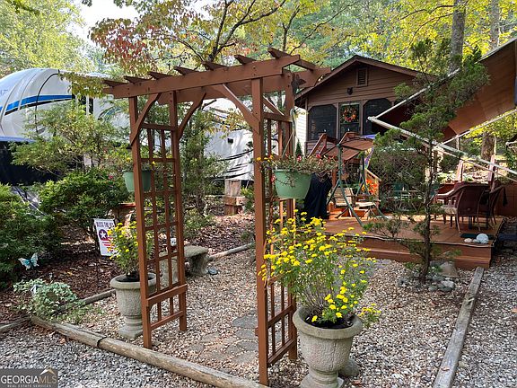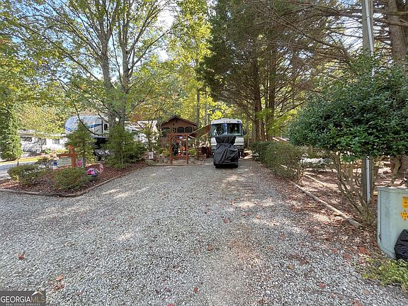 Come walk through an arbor on a stone walkway to a charming cabin nestled among shade trees, cedar trees, azaleas and multiple perennials. Inside the cabin there is a warm feeling from the Ponderosa pine walls and vaulted ceiling. It has custom Roman shades and is fully furnished with a sleeper sofa, table, chairs and an antique style electric heater. The Kitchenette has solid surface counters, solid wood cabinetry, pantry, a countertop oven and a newer full-size refrigerator. The roomy bath has a shower and three closets for your clothes and more storage. The water heater gives you almost instant hot water for your shower and Kitchen sink too! It has a small loft for napping, or storage as well! Outside you'll find a 12X24 deck with rope lights for evening ambiance and is perfect for relaxing in the swing or entertaining. There is another 8X8 deck with benches and a fire pit. The 1996 Holiday Rambler Endeavor has a queen bed and can serve for extra sleeping area with another sleeper sofa and bench/table that also converts to a bed. So, bring the family, grands, or friends to stay! There is a full Kitchen with oven/range, microwave, refrigerator and toaster oven. It has 2 TV's and a VHS player that could be fun! It's also equipped with a generator and has generous parking for 4 vehicles! You'll create a lifetime of memories here, whether you're relaxing, fishing, or participating in the ongoing activities within Paradise, a gated community. Enjoy the pool, pavilion, clubhouse, and planned activities! The location is central to all the fun in nearby mountain towns and events, just minutes from Cleveland, Helen, Dahlonega, Clarkesville, and Blairsville. Shop, dine, fish, hike, and visit vineyards-the possibilities are endless! Please note that Paradise is a vacation resort community that does not allow full-time living. The listing agents are owners in Paradise, so feel free to call for a tour or more detailed information about Paradise and this property.