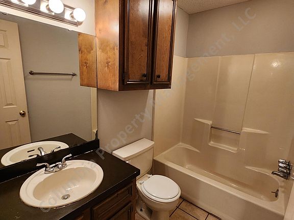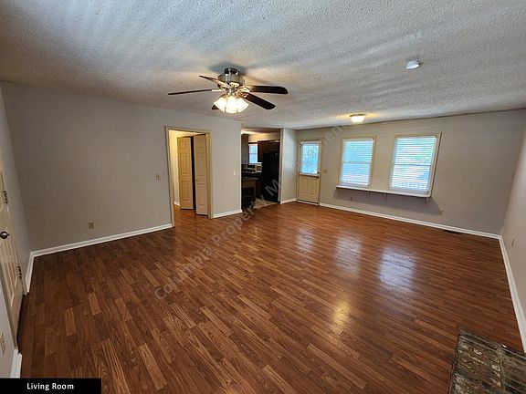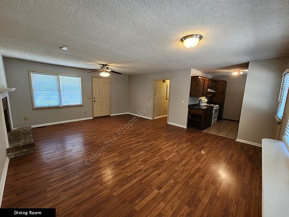 Three bedrooms, two bathrooms and combination living room/dining room. Kitchen with stove, refrigerator, and dishwasher. Laminate and hardwood floors. Gas log fireplace. Ceiling fans. Washer and dryer connections. Central air and gas heat. Two assigned parking spaces. Large fenced yard with deck. Restriction on pets. Tenant pays all utilities.