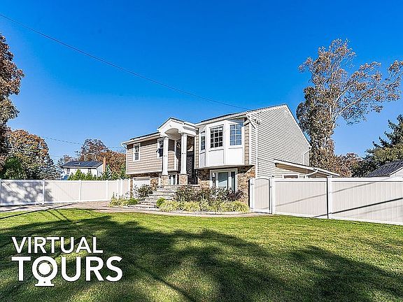 Long Island living at its finest with this exquisite four bedroom and two bath home that includes a pool, solar, smart home features, and a full movie room. This turnkey property has been updated with high end Thermador appliances, a brand new dishwasher, luxurious baths, and elegant finishes throughout. The approach to the home is impressive with an expansive front lawn, a paver driveway, and a grand front entrance.
