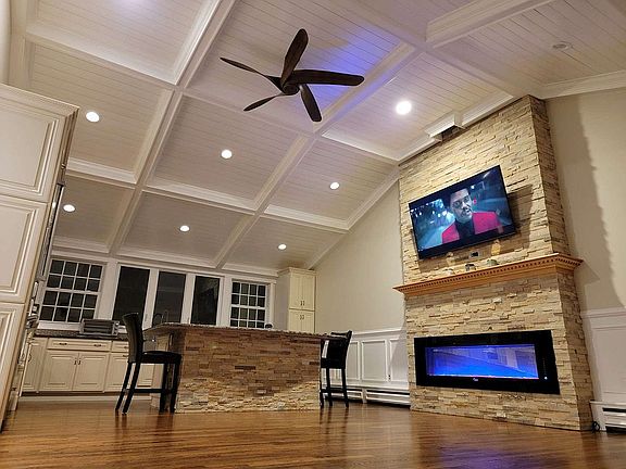 Inside, you will find brand new stained hardwood floors, vaulted and coffered ceilings, wainscoting, crown molding, and both natural and recessed lighting that brighten the entire space. The living room is set just past the foyer and includes a stone fireplace and a bay window. This room connects directly to the huge gourmet kitchen that features granite countertops, a tile backsplash, Thermador stainless steel appliances, an induction stove, and a large center island with seating for four.