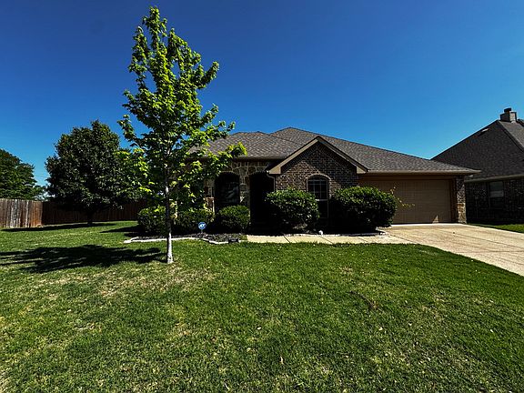 Beautifully maintained 4-bedroom, 2.5-bath home nestled on a landscaped semi-cul-de-sac lot. The open floor plan features luxury vinyl plank flooring, a spacious living area with a cozy wood-burning fireplace, and a shiplap accent wall. The oversized kitchen is perfect for entertaining, offering granite countertops, ample cabinetry, a center island, stainless steel appliances, and a Walk-In pantry. The private primary suite includes an en-suite bath with a garden tub, separate shower, dual sinks, and a Walk-In closet. Three additional bedrooms and a full bath are located at the front of the home, offering privacy and space for everyone. Highlights: Flex space for office or formal dining, laundry room with extra storage, Two-car garage with partially floored attic, Covered front and back patios for outdoor enjoyment, Spacious fenced backyard, perfect for pets or play.