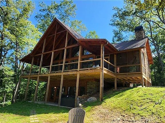 This luxurious N GA Cabin features 3bd/3bth plus Loft office with main and terrace level living rooms. Offered fully furnished with a ping pong table and hot tub plus it sits on a gently sloped 1.4 Acre lot boasting a Mtn View .. It has a gorgeous wrap-around porch on the main level & a finished terrace level that walks out to the hot tub. The main entrance to the home takes you through a tranquil, screened in porch w/stone fireplace & cozy seating to relax or entertain. Main entry door opens up into the wide open space - living/dining/kitchen area w/fireplace, beautiful vaulted ceilings w/stately wooden beams & amazing natural light coming in from the large wall of windows. Upstairs has an airy, spacious a loft plus primary bedroom w/walk in closet. Downstairs, you'll find a wet bar, rec room, stone fireplace, & hot tub. Upgraded finishes such as granite countertops, custom cabinetry, dual-zone HVAC, and tankless water heater. Come live in the Mountains in Luxury!