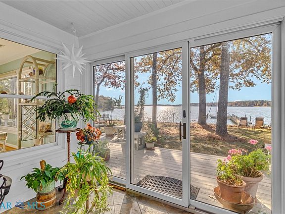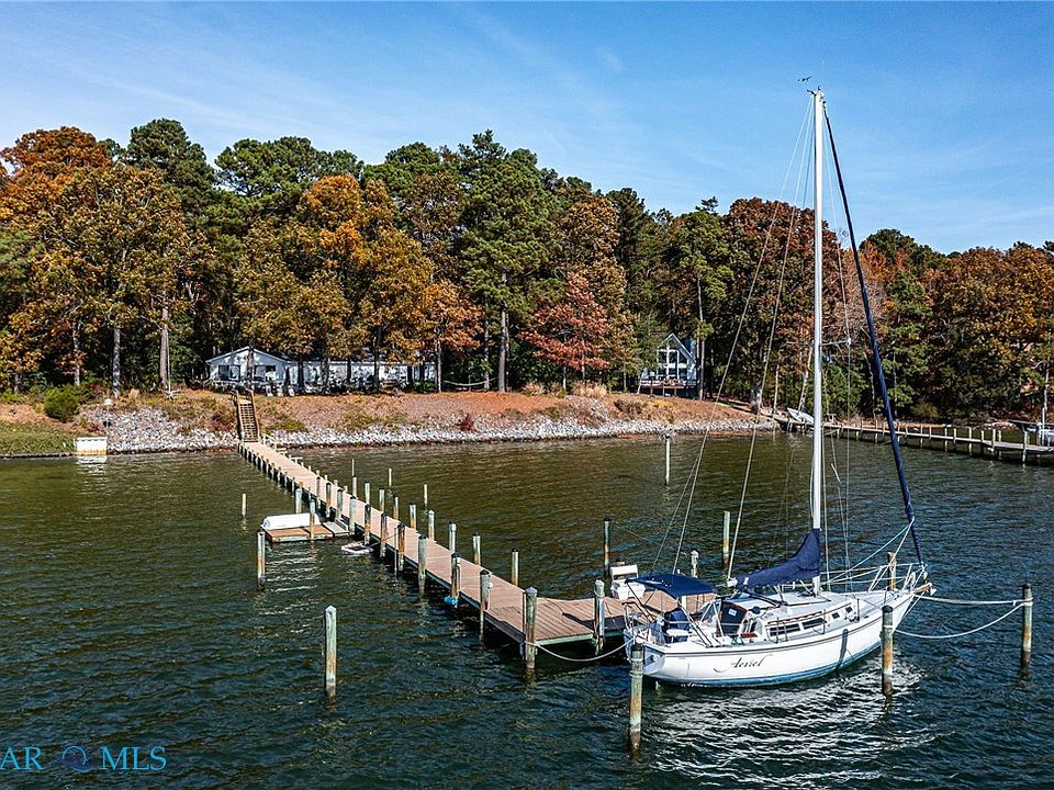 Fishing For Your Next Adventure? Chart your course for this waterfront retreat on Myer Creek at the mouth of the Corrotoman River. Welcome to a light-filled, open plan with walls of windows for expansive water views. Ideal blend of coastal living, this waterfront home features an accessory dwelling unit or multi-generational design providing separate living spaces with their own entrances, kitchens, and living areas offering more privacy & independence adding value and versatility for family or guests. Lush and mature landscaping welcomes you to this home featuring 2246 sq ft with 4 Bedrooms and 3 full Bathrooms. Inviting Living Room with wide water views, built-in bookshelves surround fireplace and opens to Kitchen with raised counter & seating, cabinetry and access to dining room. Primary Suite boosts doors to waterside deck for ideal water views, two double closets, and ensuite Bathroom with curbless shower. Two additional bedrooms with hall bathroom complete this wing. Attached but separate living quarters are connected by spacious open foyer with sliding door access to deck and waterfront for admiring sunsets. West wing provides flexibility and potential rental income with open-air living and dining room plus kitchen allowing for ease of flow and accommodating extended families. One bedroom with ensuite bathroom, laundry area with access to attached garage with 1 car bay & storage bay. Detached garage with 303 sq ft office/gym and 1 bay car/storage garage. Venture waterside to deep water Dock with over 5'+/- MLW & 3 mooring slips plus floating dock for the boating & fishing enthusiasts. 4 BD Septic, Shared Well-3 houses-approximately $137. annually. No HOA, road maintenance agreement. Buyer to verify water depth to their satisfaction. Yankee Point Marina is just minutes away with non-ethenol fuel, restaurant and swimming pool with snack bar offering Community memberships for nominal fee. Come Relax Waterside & Set Sail for more Family Fun!