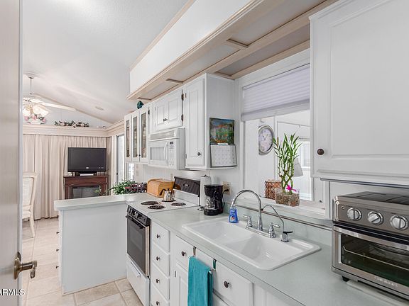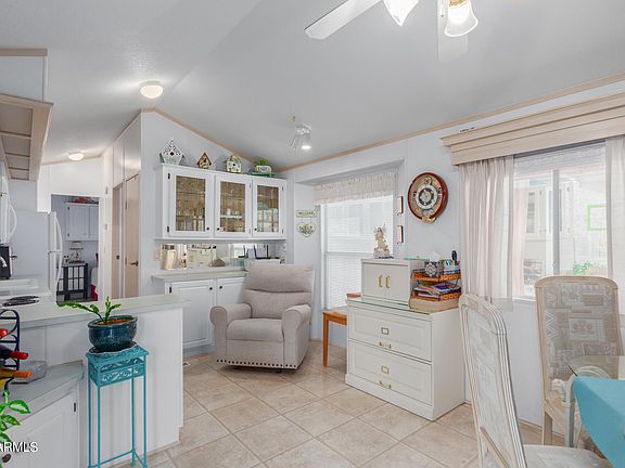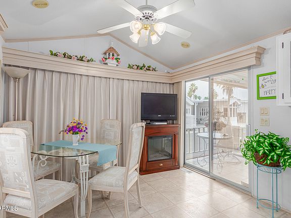 Welcome home! This charming, updated park model home is nestled in the 55+ Golden Vista Resort Community, where you own the land. Enjoy your mornings relaxing with a cup of coffee on your cozy deck. Step inside the inviting interior, showcasing neutral tile flooring, a soothing palette throughout, & a lovely fireplace. The impeccable eat-in kitchen has matching built-in appliances, a pass-through window, a pantry, & ample white cabinetry with see-through cupboards. You will find a generously sized bedroom with well-designed cabinets, drawers & a large mirrored closet. The Arizona Room is spacious & welcoming for entertaining your guests, it also boasts a second full bathroom. The home is bright with natural light plus has a protective barrier to keep your home cool. Recent updates include brand new dual pane energy efficient windows, a fully recoated roof, newer HVAC, newer hot water heater, brand new washer, and much more! There is plenty of storage space throughout the home, under the deck, and in the added storage shed too. This guard gated community has an endless array of fun activities including 2 heated pools, a large spa, fitness center, tennis/ pickleball courts, shuffleboard, batting/ golf cages, various craft shops (wood, silversmith, lapidary, pottery, etc.). There is so much more to mention! Come enjoy the Arizona sunshine and experience resort living at its finest!!