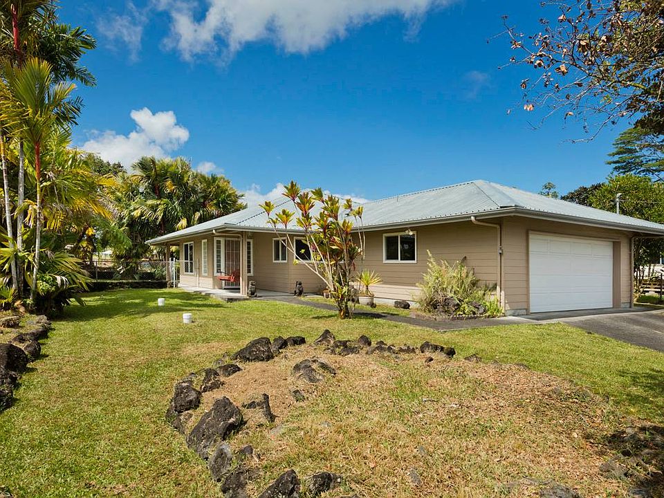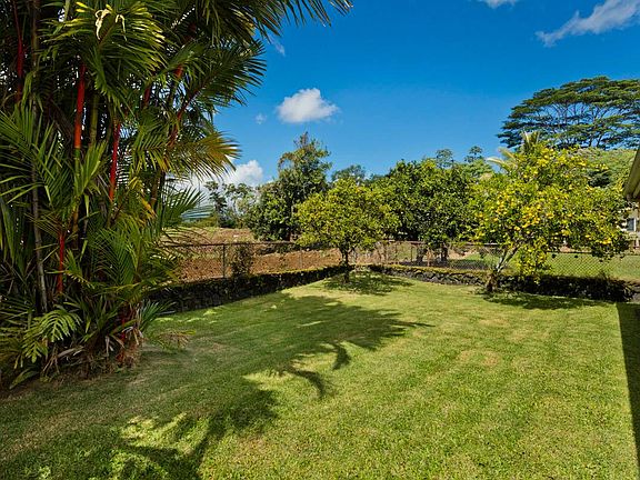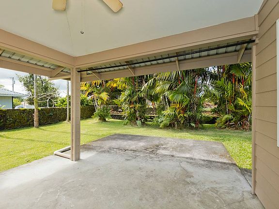 Well maintained home in Waiakea Heights ready for a new owner. Situated on high lot on the mauka side of the street, this home faces and enjoys tradewinds from the oceanside. A large swinging bench greets guests as they enter the foyer. The fenced and gated grassy yard with rock walls, is private and encompases the back half of the lot. Inside, tile floors and high vaulted ceilings help keep the home cool. The kitchen with lots of counter space, features two sinks and an island bar. In addition, there's a movable matching table for added storage and seating. Corresponding matching bookshelf built-ins are located in the den or seperate space for use as an office.