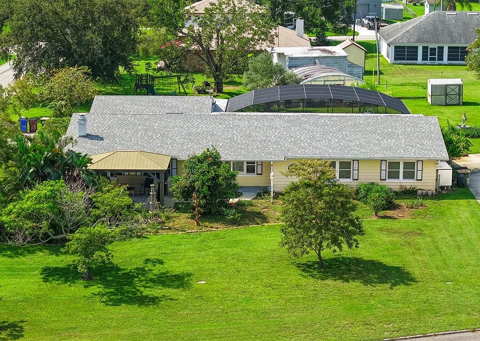 A beautiful spot to watch sunsets. A unique water view property, oversized lot of .46 acres. The list of extras and upgrades are huge. A true "Must see" not to be missed. Workshop 16 X 24 with electric, Green house, Mature landscaping. Pool 36X15, pool resurfaced 6 years ago, Screen enclosure for pool Sept 2024. Pool has gradual sloping bottom down to 8' with a water slide.. Outside shower w/solar panel for hot water. Pentair 3HP Variable speed programmable pool pump. Sprinkler system on well water. Roof installed September 2024, Hurricane impact rated double hung windows with insulated glass. 2 AC units only 5 years old. one 3-ton, one 2-ton. Lochinvar commercial 80 gal water heater, 1 element +solar panel. Ceiling fans in every room. 2 car garage with additional parking pad. Parking for a boat or golf cart. Outdoor gazebo with screening. Build in china cabinets in dining area and additional cabinets off the granite bar area that seats 6. Wood burning fireplace in great room area. Beautiful terrazzo flooring throughout the house with engineered vinyl wood planking in the master bedroom area and family room. 8 Foot sliding glass doors going from house onto pool deck. Master bathroom opens onto pool deck and is wheel chair accessible. See attachments online for all the extras and upgrades to this water view home.
