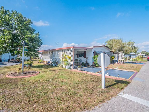 Beautifully maintained 2BR/2BA double-wide in Mid Florida Lakes! This 1,150sf home features a spacious split floor plan, renovated kitchen with granite counters, beautiful cabinetry, and newer appliances. Large bedrooms, updated baths, and new windows/doors throughout. Numerous upgrades including ROOF (2022), HVAC (2020), Water Heater (2023), and new antennae. Exterior features include 2 carports with 36' driveways, 10x15 lanai, 19' attached workshop, and a newer 10x12 detached shed. Corner cul-de-sac lot with landscape curbing, plus rear golf cart parking. Golf cart stays-new batteries + 2 new front tires! Enjoy resort-style amenities and access to the Harris Chain of Lakes in this popular active 55+, pet friendly, gated community . Move-in ready and a must-see!