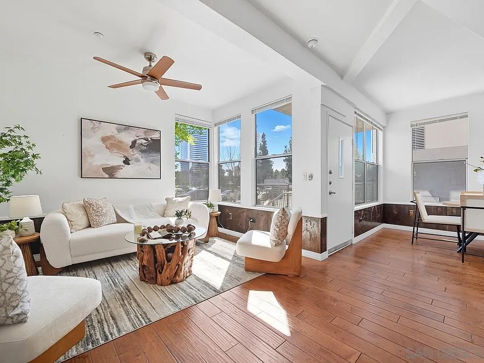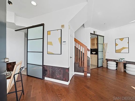 This rarely available 2-story corner townhome offers 1,360 sf of contemporary living in one of Marina district’s most desirable locations. With its private street-level entry, soaring ceilings, and oversized windows, this home is the largest of its kind at Atria on Market and perfectly blends privacy, style, and convenience. Inside, you'll find living areas bathed in natural light, solid hardwood flooring, complete with 2 primary suites. The open-concept kitchen features custom cabinetry and flows seamlessly into the dining and living spaces – ideal for entertaining or simply enjoying the vibrance of urban life. Unwind on your own front patio, where you can relax and enjoy San Diego’s golden sunsets with a glass of wine or a good book. This unit also comes with 2 assigned, underground parking spots. Designed by acclaimed architect Rob Quigley, Atria on Market is a modern garden-style building that brings nature into the heart of the city. Residents enjoy resort-style amenities including a 24-hour fitness center, business center, conference room, and rooftop BBQ lounge with skyline views. On-site security adds peace of mind, and the location is unbeatable. Steps from Ralphs, and a short walk to Seaport Village, the waterfront, Gaslamp, Petco Park, and all of downtown’s premier dining, shopping, and entertainment. Whether you’re looking for a vibrant lifestyle or a smart investment, this Marina District home has it all.