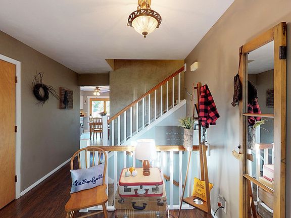 Beautiful "feel good" cedar-brick home showcases new Craftsman-style white doors & detailed trim work embraced with attractive interior color schemes! Enter into the Family Room through the displayed barn door on rail and enjoy the cozy brick wood burn fireplace. Living Room offers 4 side-by-side glass windows allowing for an open country view. Inviting Dining Room features built-in hutch and an attractive chandelier. Butler's swing door opens into the white and gray Kitchen hosting a double oven with convection, stainless steel appliances, pantry, tile back-splash, planning desk, breakfast bar and new full view atrium patio door. Master Bedroom has 2 closets. 5' wide espresso colored vanity, barn-wood look flooring, subway tile surround tub-shower with built-in niches are displayed in upper level full bath. Some hardwood flooring finish the Bedrooms with wall-to-wall closets and secret attic door too. Open white mission-style spindled stair case welcomes you to the lower level Family Room, Laundry Room, 2nd updated Bath and finished Basement. Custom full glass "Laundry" door, wood-look tiled flooring, sink, utility cabinet, clothes chute and storage cabinet complete the Laundry area. 3/4 Bath offers frameless glass door with pebble-stone flooring in shower, subway tile, Kohler pedestal sink and wainscoted ceiling. Finished Basement offers bonus Recreation Room, "Northwoods-feel" dry bar, recessed lighting, brand new carpeting and trim. Andersen and Pella windows, patio and mature trees complete this lovely decorated and pristine Home SWEET Home!