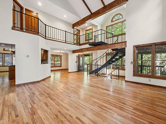 Soaring stone fireplaceHardwood floorsCustom iron staircaseScreened-in porch