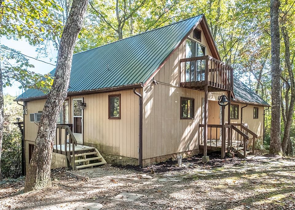 Hidden away on nearly an acre of woods, this charming 2-bedroom, 2.5-bathroom cabin with a spacious bonus room offers the perfect blend of rustic character and mountain tranquility. A concrete driveway leads you to the detached one-car garage, with additional parking closer to the house. Step up onto the front porch and through the foyer into the inviting living room, where wood floors flow throughout the main level. You'll love the warmth of the rustic paneled walls, gas-log stove, and vaulted ceiling adorned with decorative log beams. Double sliding glass doors open to a full-length back deck that overlooks the peaceful forest and offers a peekaboo mountain view. The kitchen features abundant cabinet and counter space, a pantry with built-in shelving, a convenient pass-through window, and a cozy breakfast area. Down the hall, you'll find a guest bathroom, a comfortable guest bedroom, and a spacious Master Suite complete with a large walk-in closet and private en suite bathroom. Upstairs, the airy loft overlooks the living room below and features a vaulted wood ceiling, a shuttered interior window, and a private balcony surrounded by treetops. A half bathroom and generous bonus room complete the upper level, offering flexible extra space. Downstairs, the large basement includes a laundry area with a utility sink, two exterior doors, and plenty of unfinished space ready for your personal touch.. Previously used as a rental, this cabin is livable as-is but could shine with a bit of TLC. Located in a quiet area with few close neighbors, it provides privacy, space, and the peaceful sounds of nature—all within reach of modern comforts.