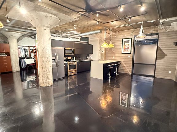 This condominium offers an open floorpan with over 10 fit. high concrete ceilings. It's been been meticulously cared for and updated with epoxy floors, an updated kitchen with plenty of cabinet & counter space, stainless steel appliances, a gas range rarely used ;), electric blinds, tinted windows, updated lighting throughout,a feature wall in the bedroom and custom closet to help you look organized, an updated bathroom with gray tiled walls and a black metal vanity perfect for this industrial vibe.