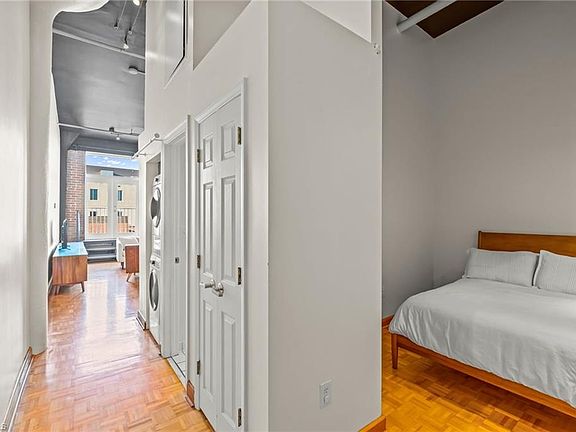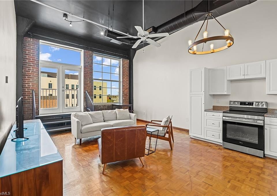Fantastic condo offering in Albert Hall. This charming one bedroom one bath near Innovation Quarter combines historic charm with modern conveniences. Enjoy exceptionally high ceilings, parquet floors, exposed brick, natural light and a private balcony while having the benefits of new kitchen appliances, stackable laundry, and two dedicated indoor parking spaces with elevator access. Close to all that downtown offers including restaurants, shopping, coffee shops, and Bailey Park with the advantage of being slightly off the main path.