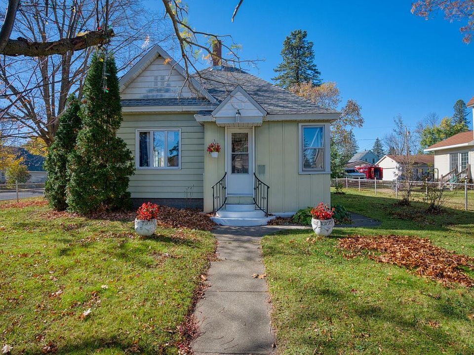 Welcome to this delightful 2-bedroom, 1-bath home perfectly situated on an oversized, fenced corner lot in the heart of downtown Eveleth. Step inside to discover stunning hardwood floors flowing throughout the living room and both bedrooms, adding timeless elegance and warmth. Enjoy your morning coffee on the inviting 3-season front porch, where abundant natural sunlight creates the perfect spot to relax and unwind. The unfinished basement offers endless possibilities—transform it into additional living space, a home office, recreation area, or workshop to suit your lifestyle. Outside, the extra-large fenced yard provides ample room for gardening, entertaining, pets, or play, while the convenient 2-stall garage offers plenty of parking and storage. With its prime downtown location, you'll enjoy easy access to local shops, dining, and amenities. This home blends classic charm with modern potential—ready for you to add your personal touch and make it your own. Call for a tour!
