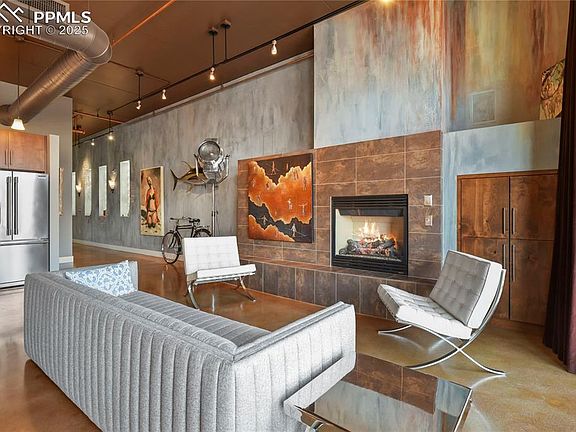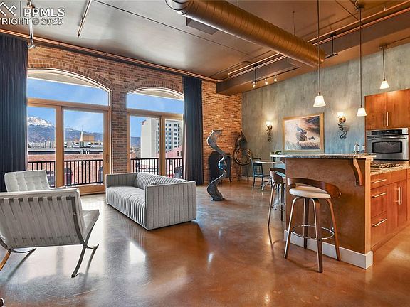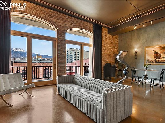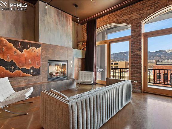 Experience the best of loft living with breathtaking mountain views from this top-floor, end-unit loft in the heart of downtown Colorado Springs. Pikes Peak takes center stage from your private balcony, while the energy of the business and arts districts is just outside your door. Inside, this two-bedroom, two-bathroom loft offers a stunning blend of industrial character and modern luxury. Featuring soaring ceilings, exposed brick, and polished concrete elements, all complemented by custom wall treatments throughout. The open-concept living area is anchored by a gas fireplace and flows seamlessly into a gourmet kitchen equipped with granite countertops, gas range, double ovens, refrigerator, dishwasher, tile backsplash, and under-cabinet lighting. The primary suite is a true retreat with its generous size, walk-in closet, and en-suite bath. The second bedroom offers a full wall of exposed brick, perfect for guests or a home office. Additional features include in-unit laundry, storage unit, and a deeded parking space in the secure, attached garage. Soundproofed walls ensure a quiet and private living environment, while HOA dues cover all utilities. With its unique interior design, unbeatable location, and sweeping mountain and city views, this loft offers a rare opportunity to own a distinctive and highly sought-after downtown home.
