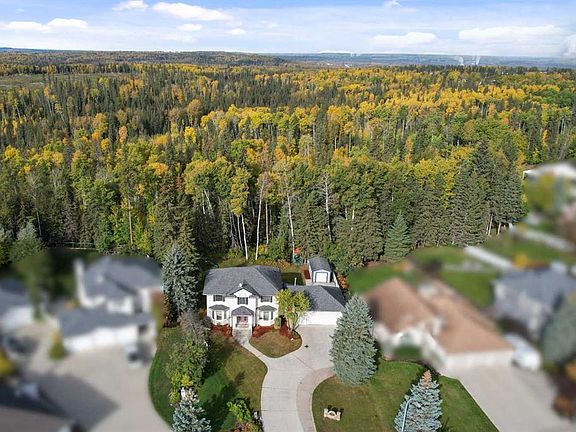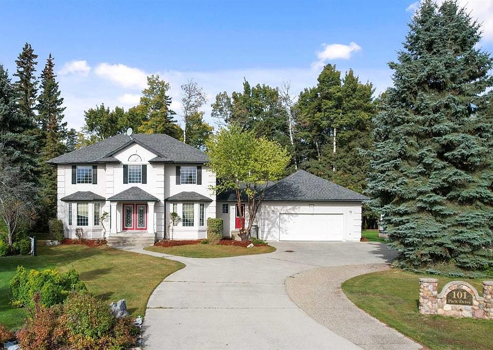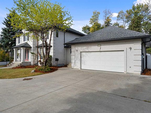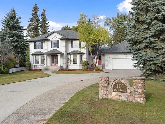 This beautifully crafted 6-bedroom home commands attention from the moment you arrive. A true storybook residence with timeless appeal, it sits proudly in one of the area’s most prestigious neighbourhoods—backing directly onto the park for exceptional privacy and views. Step through the grand front entrance into a warm and welcoming space where craftsmanship meets comfort. The main level offers a front office or den, a large formal dining room, and an open kitchen with a breakfast area overlooking the private backyard. The adjoining living room is bright and inviting—perfect for gathering with family or entertaining friends. A convenient 2-piece bath sits near the side entry and heated garage, along with a full laundry room down the hall. Upstairs, you’ll find four generous bedrooms. The primary suite is a true retreat, with a peaceful view of the backyard, a soaker tub, separate shower, water closet, and walk-in closet. Hardwood flooring and rich wood windows throughout add warmth and character. The walkout basement extends the living space with a spacious family and games area, two additional bedrooms, a full bath, and a mechanical room. All plumbing lines have been updated to PEX October 2025. Step outside to your private outdoor oasis—complete with a cobblestone patio, relaxing hot tub, fire pit area, two sheds, and even a treehouse. This is a home built to be admired—and to be lived in, with beauty and function that stands the test of time.