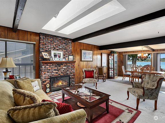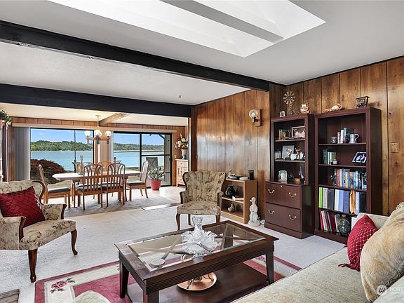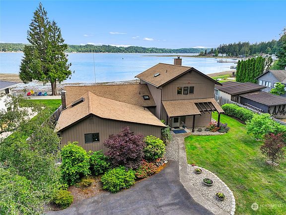 Enjoy sunrises from this magnificent No Bank waterfront home w/ highly desirable Southern exposure! This home opens to a sunny floorplan w/skylights + a wall of windows, adding an abundance of natural light thru-out. 2 Cozy FP's + wet bar + wine cooler add ambiance for entertaining. Beautiful chef’s kitchen w/ SS appliances + pantry & large island w/cooktop + high end finishes. Main flr has two generous beds + 3/4 powder room renovated in 2020 + utility room. Upper level features spacious primary suite w/water views + private deck + 1 full bath + den//office. Backyard oasis featuring spacious beach front partially covered deck + beautifully maintained yard + newer roof. No bank 90" waterfront w/tideland rights. Welcome home!