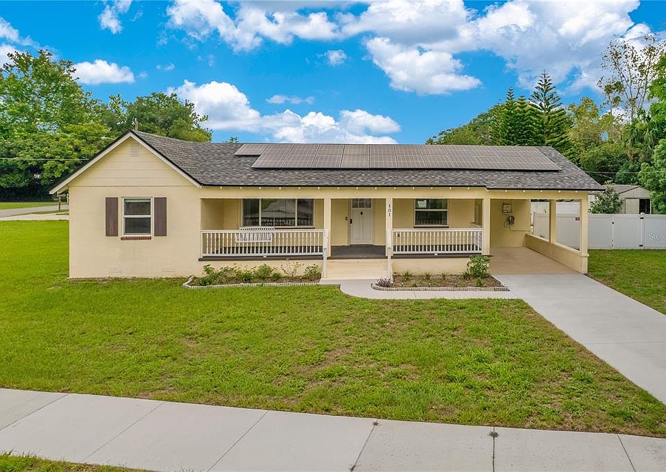 Welcome to 101 Naranja Road! This 1949 historic charmer offers block construction, an old-fashioned front porch, and a large .30 acre lot! Step into this move-in-ready 3-bed, 1-bath home and be greeted by original heart pine floors (refurbished in 2019) and doors with elegant brass hardware. This home is a BIG ENERGY SAVER: double-paned windows and OWNED SOLAR PANELS. The pretty kitchen features granite countertops, shaker cabinets, and stainless-steel appliances. Enjoy plenty of storage and doing laundry inside this 9x11 utility room/mud porch/pantry (not included in sqft) and a 12x16 shed. Updated with the modern comforts of today: ROOF - 2022, HVAC (2014), well (2016), drain field - 2018 (septic last serviced/pumped 2021), and tankless water heater (2018). Beyond its charm and visual appeal, this home is conveniently located near hiking trails, parks, SunRail, and I-4 and 30 minutes to the BEACH! Don't miss your chance to get in on the action that is GROWTH in DeBary - and 101 Naranja Road is your ticket!