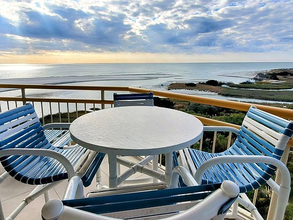 Spectacular views of the ocean Creek and southern coastline from the balcony as well as from the living area, dining area and master bedroom. Interiors have been updated with solid surface kitchen counters and Shaker cabinets, stainless appliances and LVP flooring in the living areas and bedrooms. Baths have updated vanities, granite counter top and recently resurfaced shower and tub shower. Currently available to show at short notice. Ocean Creek has 57-acres of park-like grounds. 24-hour gated security, tennis center, pickleball court, putting green, multiple outdoor pools, and an indoor pool with whirlpool. The community boasts a wonderful oceanfront beach club with a snack bar and grill open in season, sand volleyball court, outdoor pool, playground, lockers, and restrooms. All figs. & sq. ft. approximate.