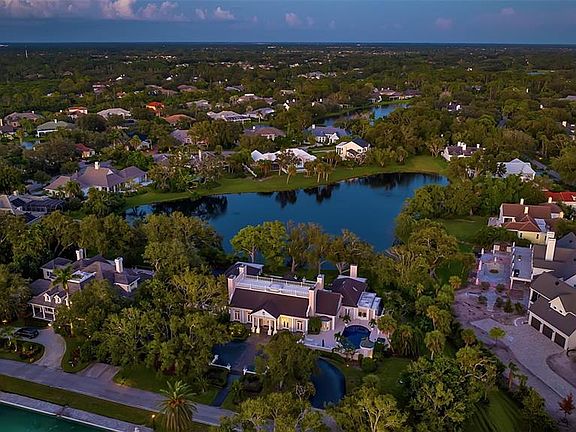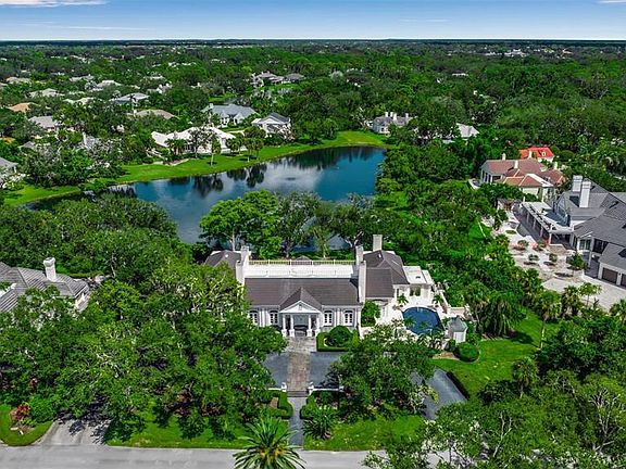 A grand estate where timeless design meets lakefront tranquility, 101 Osprey Point Drive offers refined living within the private gates of The Oaks Bayside. Designed by architect Bo MacEwen, this one-of-a-kind home spans more than 5,000 square feet, all cleverly positioned on nearly an acre with 150 feet of lakefront. Situated on two of the community’s most desirable lots, the residence balances architectural distinction with thoughtful updates that ensure comfort and livability. An oversized circular drive paved in granite tile leads to a stately double-door entrance. Inside, the foyer sets the tone with soaring ceilings, hand-crafted moldings, chandeliers, and a white onyx floor with marble inserts. Spaces include an oversized living room with dual fireplaces, a crystal chandelier, and multiple sets of French doors opening to the lakefront patio. The dining room, anchored by another fireplace and framed by custom casings and built-in shelving, is ideal for grand entertaining. A domed ceiling sitting room with French doors to the patio adds an intimate space for cocktails or conversation, while the custom bar and wine room, with etched glass cabinetry, stone counters, and display shelving, enhances the home’s appeal for gatherings. The kitchen, completely remodeled in 2019, is a showcase of craftsmanship with UltraKraft® cabinetry, custom soffit lighting, Corian countertops, and a center island with breakfast bar. Luxury appliances include a Sub-Zero refrigerator, Wolf gas cooktop, wall oven, microwave, warming drawer, two KitchenAid dishwashers, and a Frigidaire wine fridge. A butler’s pantry provides additional storage, while the sunny breakfast nook overlooks lush gardens. Family and gathering rooms carry the same sense of scale, with dramatic fireplaces, intricate moldings, and detailed ceiling treatments that flow seamlessly for everyday living or large-scale entertaining. The primary suite is a true retreat with a spacious sitting area, custom closets, and a well-appointed bathroom that was newly remodeled in 2025 with spa-inspired finishes. Three guest suites, each with updated full baths (2021 and 2025), provide privacy and comfort. One is a suite with a bathroom near the laundry room, which offers flexibility for live-in staff or extra accommodation. Outdoors, the home embraces its setting with an open pool, expansive deck, and cabana surrounded by manicured hedges and mature landscaping. The views are equally compelling, with mature gardens and community reflecting pond in the front and sweeping lake vistas in the back. Additional highlights include a three-car garage, refinished hardwood floors (2020), and a new Daikin 5-ton AC system installed in 2022. Ownership at The Oaks Club brings an unmatched lifestyle, with two championship golf courses, tennis and pickleball courts, croquet, a fitness center and spa, three on-site restaurants, and a community dock on Little Sarasota Bay. Elegant yet inviting, 101 Osprey Point Drive stands as a rare opportunity to enjoy lakefront living with resort-style amenities in one of Sarasota’s most established private enclaves.