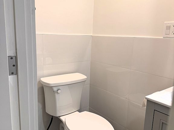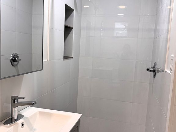 The bathroom is finished with porcelain floor and wall tiles, a sleek vanity and medicine cabinet.