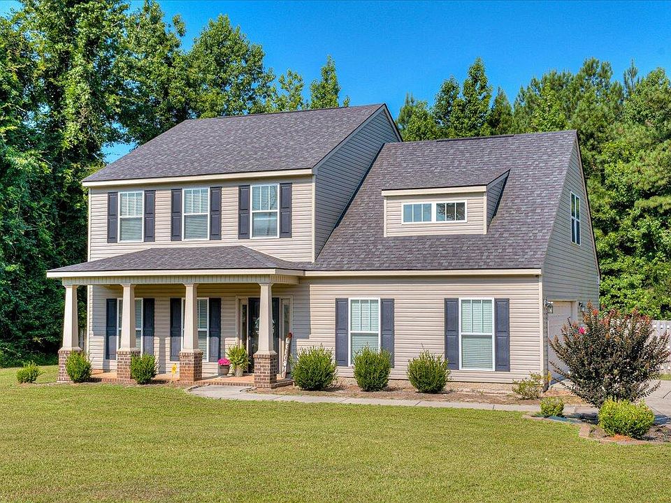 Located in The Ridge subdivision in north Burke County, this 4-bedroom home offers generous spaces, inside and out. The open floor plan features an eat-in kitchen with center island, large pantry and French doors that open up to the covered back patio. The primary bedroom suite is located on the main floor and boasts a large walk-in closet and en suite bathroom with shower, garden tub and double vanity. A downstairs half-bath serves guests. Upstairs, the home offers three spacious spare bedrooms, a full bathroom and an and large common space perfect for a sitting area, playroom or study area. The large backyard is private and level.