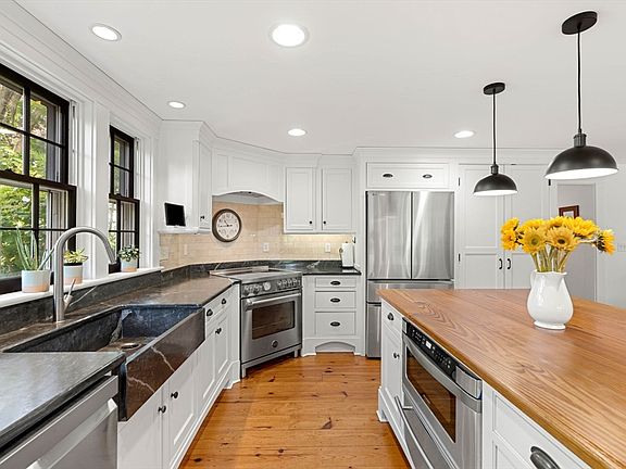 Located in the sought after Merrimacport neighborhood, indulge in this quintessential, waterfront home - exceptionally crafted & impeccably designed. In 2006 this side entry Greek Revival was tastefully transformed into the stunning, contemporary Colonial it is today. Featuring an open concept floor plan, stunning pine wood floors seamlessly fill the space. The chef's kitchen exudes elegance, where function & style abound. Featuring a large island with seating, Vermont soapstone countertops & luxury stainless appliances. This gorgeous home offers a spacious primary suite with a cozy fireplace, primary bath and dual, walk-in closets. Escape outdoors and immerse yourself in the extraordinary panoramic views overlooking the Merrimac River. This outdoor oasis offers two patio areas, boat house, potting shed & mature gardens; a fresh running stream into a stone-detailed pond & a private dock ready for warm summer nights. Close to major highways and a quick boat ride to downtown Newburyport.