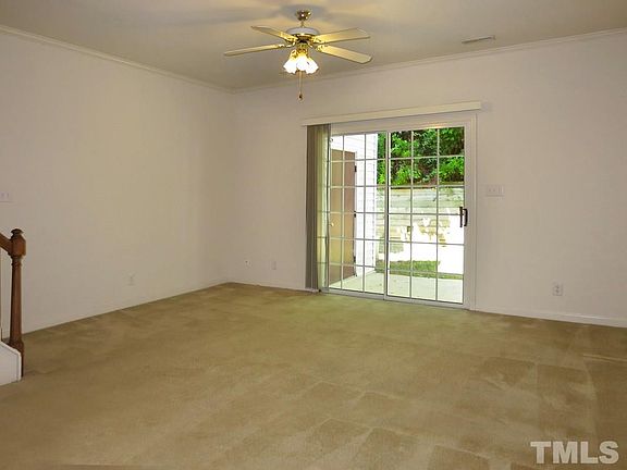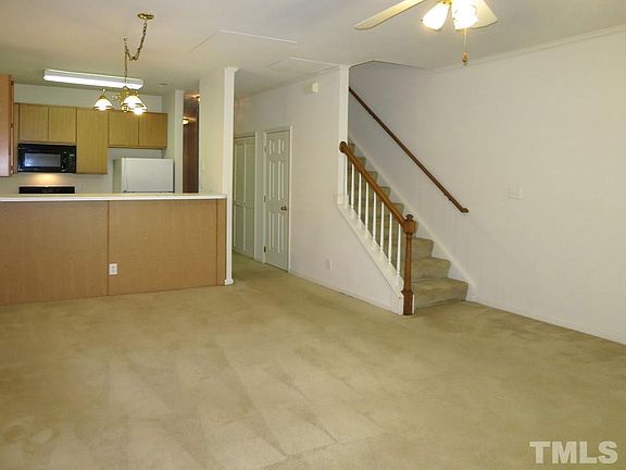 Ridgehaven Townhome, walk to Carrboro High. Living and dining areas combine with a ceiling fan in the living space. Pass-through breakfast bar to kitchen. Kitchen appliances included. Glass slider to patio area in back, wooded views & attached storage closet. 1st floor bedroom has direct entry to bathroom on the floor. Washer/dryer included. 2 bedrooms and bathroom up. Community has a play area. Pet w/fee & prior approval.