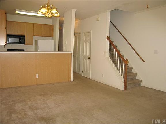 Ridgehaven Townhome, walk to Carrboro High. Living and dining areas combine with a ceiling fan in the living space. Pass-through breakfast bar to kitchen. Kitchen appliances included. Glass slider to patio area in back, wooded views and attached storage closet. 1st floor bedroom has direct entry to bathroom on the floor. Washer/dryer included. 2 bedrooms and bathroom up. Community has a play area. Pet w/fee and prior approval.