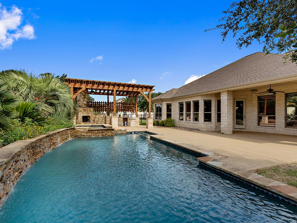 ** Call 512.906.4503 to schedule a showing of this beautiful home ** This Texas sized stucco and stone home has everything a family could ask for. The massive front lawn with gorgeous landscaping leads to the solid wood double front door. Inside you will find 4 bedrooms 4 baths, 2 dining areas, a huge living room and a separate office. The kitchen features impressive custom cabinets, a gas range, center island, separate oven and a built-in microwave. This open floor plan splits the master bedroom from the secondary bedrooms. The master features a radial bay window and a spa like master bath. Across the home, you will find the other three bedrooms, two sharing a Jack-n-Jill bathroom and a bathroom located in the hallway, close to the other bedroom. The fourth bathroom is away from all the bedrooms, located next to utility room. The huge utility room is filled with custom cabinets that offers more storage than you can plan for. But the true joy of this house, as precious as it feels, is not on the inside but the outside. The pools beauty is accented by natural rock and a waterfall. A hot tub sits right next to it for those tighter aquatic social gatherings. Beyond that is a cabana complete with an outdoor kitchen and fireplace. The rest of the yard is majestic. Perfectly place trees and landscaping is scattered through the backyard. Stone pillars are connected by a black, iron rod fence with shrubs filling the gaps for privacy.