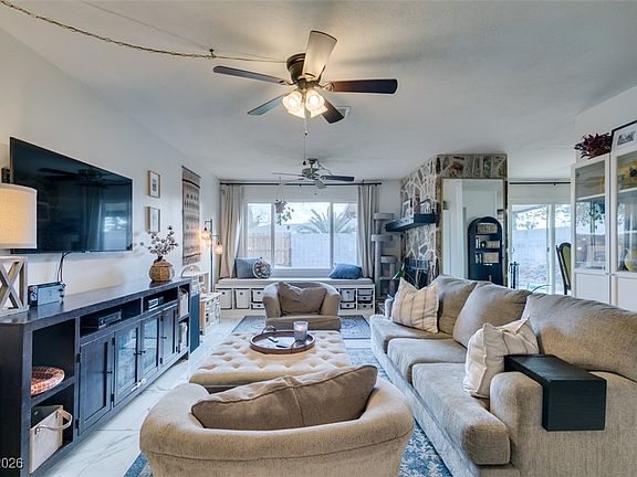 Extremely charming, light-filled single-story home in a prime location just off Summerlin Parkway and the 95. A paver walkway and front patio welcome you into bright, open living space featuring a beautiful stone fireplace with a custom wood mantle — full of warmth and character. The kitchen offers tasteful updates including quartz countertops, tile backsplash, workstation sink, and modern fixtures. Both bathrooms have been beautifully remodeled, including a reimagined primary suite with a custom tiled walk-in shower and dual sinks. Tile floors run through the main living areas with LVP in bedrooms and baths. Step outside to a peaceful backyard retreat on an oversized corner lot. Enjoy the large covered patio, built-in gardening beds, paver lounging areas, and a gorgeous mature shade tree — perfect for morning coffee, weekend gardening, or family BBQs. Move-in ready and centrally located near prime shopping, dining, and freeway access.