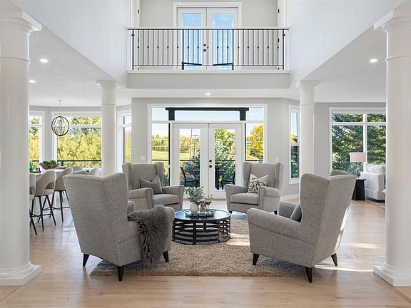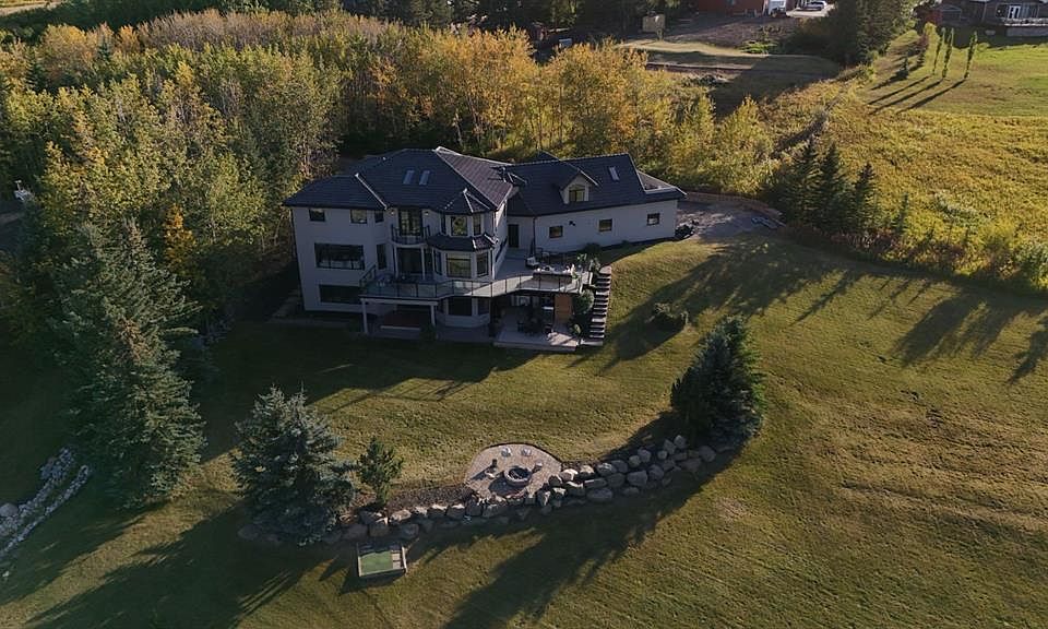 **Check out our CINEMATIC TOUR (iGUIDE)*** Walking distance to the Bearspaw Farmer's Market, 2 min from Hwy 1 access, Rocky Ridge Co-op, Gas Stations, 5 min to Tim Hortons-101 Nagway Court is a gem of a property in the BEST location yet, tucked away for ultimate privacy. Experience refined acreage living in this stunning 6145 sq. ft. two-storey estate, backing onto Bearspaw Golf Course. Heavily renovated in 2022, this contemporary home offers exceptional craftsmanship, modern finishes, and seamless indoor-outdoor living. The private tree-lined driveway prepares you for your serene retreat after a long day. Standing in your grand foyer with exquisite chandelier, you’re welcomed by the open view of entire main floor, complete with 20ft ceilings. Windows on all sides makes this space bright, bringing in the natural surroundings giving it a calm and peaceful atmosphere. Renovations in 2022, include 90 new triple-pane windows, refinished hardwood floors, new countertops, new lighting, upgraded electrical (200 amp service), new paint throughout, and relocated the staircase bringing in brand new stairs and railings. The main floor design is very functional. The laundry room and mudroom have ample storage and working countertops. The large kitchen is very bright and airy, with stainless steel appliances, large pantry leading to a breakfast area where you can enjoy the natural landscape view of the back yard. The impressive stone fireplace in the living room invites you to pour a glass of your favourite beverage and relax. The dining room is enhanced by the natural beauty of the accented wood flooring. The architectural walkways that beautifully connect the upper floorpan and the wall of windows in the kitchen give this home its modern feel, that WOW factor. The upper level features spacious bedrooms, a bonus room with loft feel leading to out to a balcony, and several skylights. The primary bedroom/ensuite is a true retreat; complete with large walk-in closet, a luxurious 5-piece ensuite with shower and jetted tub and a Juliet balcony to take in the fresh air. The walkout basement features 1 more bedroom, a 4pc bathroom, an office (flex room), wine cellar, games room, and den area. Outside, enjoy several decks on all levels, a pergola, stone patio, fire pit and a covered outdoor stainless steel kitchen, perfect for entertaining or enjoying a family meal- the outdoor pizza oven takes pizza night to the next level! Attached is a heated four-car garage with Sunshine doors and polyaspartic-coated floors. Complete with a full home security system and just minutes from city amenities, this home blends timeless elegance with modern acreage living.