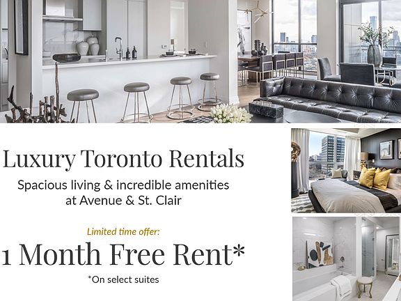 AboutLimited Time Offer: Receive 1 month free rent on select suites!* Presenting luxury rental residences in one of Toronto's finest locations at Avenue Road & St. Clair, adjacent to the prominent Forest Hill neighbourhood. Located in the heart of Imperial Village, an award-winning master-planned community by Camrost Felcorp Inc., 101 St. Clair offers a refined lifestyle with modern conveniences. With 1 bedroom, 1+den, 2 bedroom and 2+den suites, residents will enjoy luxury finishes, breathtaking views, and access to the exclusive Imperial Club, with more than 30,000 square feet of incredible fitness and lifestyle amenities.