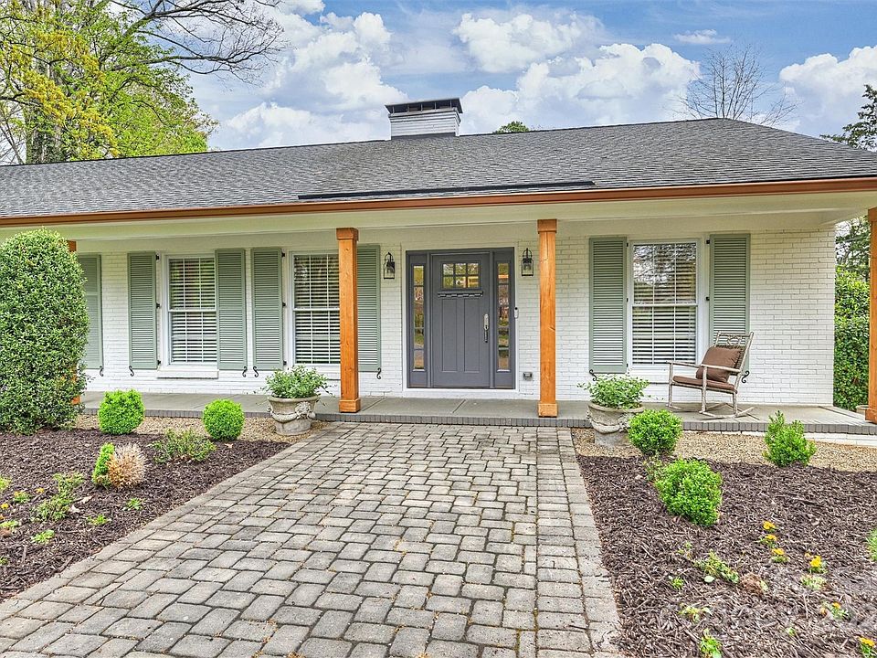 Pull into the circular drive of this 3/4 acre property and take in the park like setting! This beautifully updated ranch has all the features you are looking for. In addition to the 4 bedrooms, you'll find a private office, secondary office/flex space, and two common area living spaces. The kitchen updates include custom cabinetry, new tile backsplash, open wood shelving, marble counters, under-counter microwave drawer, and a stainless steel dual-fuel Bertazonni range. Design details throughout the house include coffered ceilings, wood trim mouldings, all new paneled interior doors with crystal door knobs. Custom closet finishes in primary, pantry, laundry, flex space. All bathrooms have been updated with custom cabinetry, wood mouldings, and marble tile. Fenced garden with raised beds off of the shed/workshop. All of the outdoor spaces along with the open floor plan make this home great for entertaining! Close to Charlotte's top private schools.