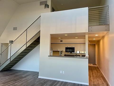 Upscale Penthouse loft apartment in downtown Santa Cruz. Interior finish with designer color scheme, new floors. Loft bedroom suite over looking living room, plus separate one bedroom. This apartment has large walk-in closets! Private wrap around balconies with Mountain views plus sweeping views of Pacific Ave. Includes one parking pass for Front Street garage. Common area roof top patio and coin-operated laundry room. Just upstairs from shops, restaurants, entertainment and transportation. Downtown location offers unique lifestyle amongst bustling Pacific Ave. One year lease.
