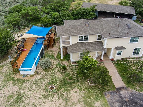 Lake Ridge Estate Country Living at its very Best, Spacious Two Story Family Home W/ Lots of Updates & Upgrades on Aprox. 8.6 Acres, Consider it your Ranch W/ Wildlife Acreage, 5 minutes from a Summer Cool Down at Lake Amistad. Lawn Features Natural Gardens W/ Fruit Trees & Young Shade Trees Watered from Gutters and Downspouts and 4000 Gal. Rain Collection Tank System. Home brings in Rays of Natural Light w/ Large Rooms for Personal & Family space. High Ceilings, Sky Lights, 4 Large Bedrooms, Featured Music Studio, 3.5 Bath Rooms, Laundry Room, Open Floor Plan W/ Large Living Room & Fireplace. Feel the Breeze when you open the French Doors leading to the Back Patio & Shaded Back Yard. Upstairs Multi-purpose Room w/ Fireplace and a Covered Terrace with views toward the Sleeping Lady Mountain. Master Bedroom w/ Jacuzzi & Walk-In Closet. Glass Doors open to the Balcony & Wide Staircase leading to 8'X40' Heated Custom Lap Pool & Spa, Bluetooth Control, Safety Cover. Locking large Deck is Designed W/ Privacy Curtains & Shade Sails that facilitates Incredible Stargazing Family Fun. Two AC/ HVAC Units, Kenetico Water Softener, Under sink Water Purifier. Barn Features 1/2 Bath and second Laundry Area W/ Hot Water, Workshop, space for up 4 Vehicles. Outback a Roofed Area for Horse Stalls, Chicken Coops & Fenced Pasture for Domestic Animals.