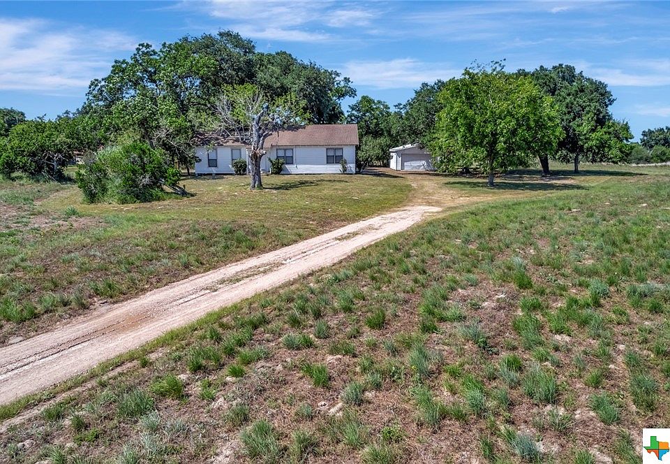 Welcome to country living! This +/-1240 sqft., move-in ready, 2BR, 1BA home with gorgeous, mature oak trees, on +/- 7.5 Acres of wide-open spaces is close to town and a beautiful, Rare Find!   Step inside the bright living area with a cozy faux fireplace, trimmed-out windows, and crown molding throughout.  The kitchen with so much character, has tons of storage cabinets, a painted wood ceiling, a ceiling fan, a breakfast area, and the perfect scalloped trimmed window.  Just off the kitchen is the perfect dining room/could-be study that includes a vintage phone nook. There is also access to the bathroom and the laundry room.    The primary suite is roomy with an adorable bathroom that includes antique touches, including a mirrored medicine cabinet and extra storage about the tub/shower.  Step outside and entertain with family and friends, there is plenty of room for pets, a garden and so much more!  Park your cars in the large, detached garage!  Schedule your showing today!