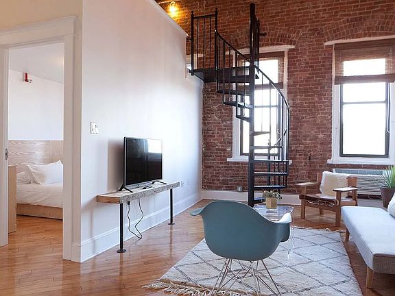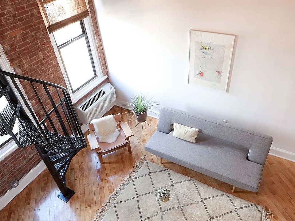 The loft features soaring 14ft ceilings, exposed brick, and stripped wood beams. The loft also has a spiral staircase leading to large open mezzanine area that over looks the living space of the loft. This area could be a great sleep loft, cozy lounge area or office, or just great for extra storage. The loft also has a large kitchen, which gets great natural light from a large skylight and features stainless steel appliances including dishwasher and modern new bath with shower. The building features a large lobby area with sitting area, a laundry room, and freight elevator.