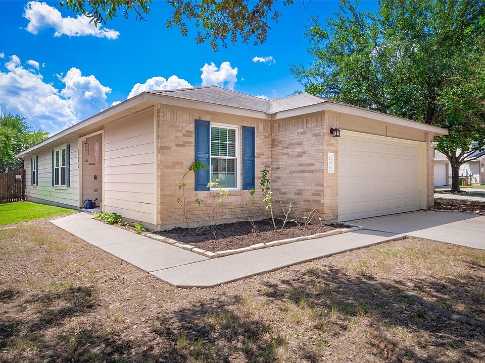 This charming 3-bedroom, 2-bath home sits on a desirable corner lot with mature trees offering shade and privacy. Featuring welcoming curb appeal and two-car garage, this home has been thoughtfully updated for modern comfort. Inside, the open-concept layout is warm and inviting with terracotta tile flooring throughout the entire home. The kitchen has been refreshed with open shelving, new dishwasher, new microwave, new black farm sink, and plenty of counter space, seamlessly connecting to the dining and living rooms. The spacious living room offers natural light and backyard access, while a bonus flex room is perfect for an office, media space, or workout area. The primary suite includes a private bath and large closet, while two additional bedrooms and a full guest bath provide comfort and flexibility for family or guests. Step outside to your private backyard retreat featuring xeriscaping for easy maintenance, a covered patio to beat the Texas heat, and a flagstone entertaining area—ideal for relaxing evenings or weekend gatherings. Great location—conveniently located near schools, shopping, dining, and commuter routes, this move-in ready home combines charm, function, and efficiency.