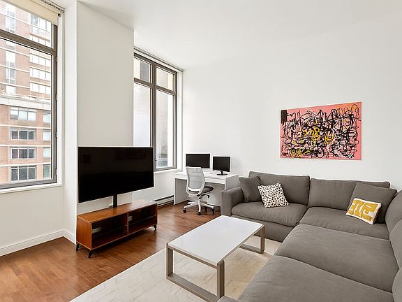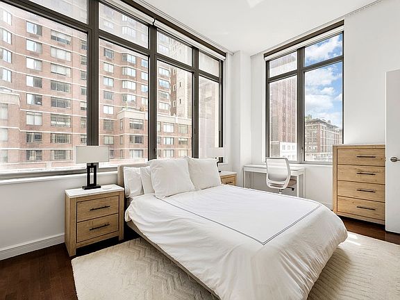 The primary bedroom faces both east and south. It can hold a king bed with side tables, a dresser and a desk comfortably and has two closets. Additional details include custom fitted closets, shades, central air conditioning, a washer/dryer in the unit and a storage cage.