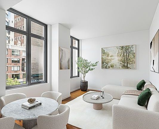 This loft-like, light filled apartment features 11ft ceilings and oversized windows. The thoughtfully designed main room is large enough to comfortably fit a dining area and living room setup, making entertaining easy. The open kitchen features Macassar Ebony wood cabinetry, Pietra Cardosa stone countertops, a Fisher and Paykel double drawer dishwasher, and a Sub-Zero refrigerator and wine cooler, cooktop stove, and microwave.