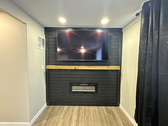 The **living room's designer accent wall and sleek electric fireplace** create a warm, stylish ambiance, while **luxury vinyl plank flooring** and **porcelain tile in the bathroom** deliver a refined, low-maintenance finish throughout.