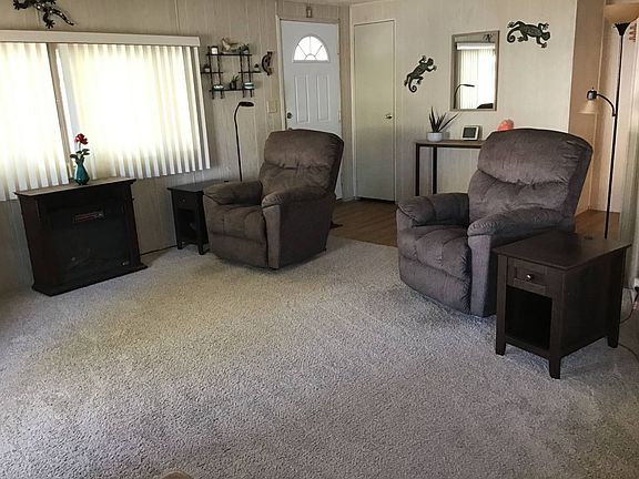 This move-in ready home is thoughtfully designed for your comfort and convenience, offering appliances, fixtures, furniture, and an array of personalized extras. A welcoming front living room entrance leads into a charming dining area with a built-in hutch, while the efficient step-saver kitchen features additional built-ins for easy organization. The guest bedroom is conveniently located next to a full bath, and the primary bedroom suite includes its own built-in laundry area and a spacious walk-in closet. Recent updates include a partially painted interior, freshly painted exterior, recoated roof, dual-pane windows, a newer HVAC system, and replaced water lines. Outdoor features include covered parking, an attached workshop, a covered front patio, and an extended back patio surrounded by attractive landscaping-perfect for relaxation or entertaining. Call today to schedule your appointment to view! Note: Lot rent is subject to change based on current community rates at the time of closing.