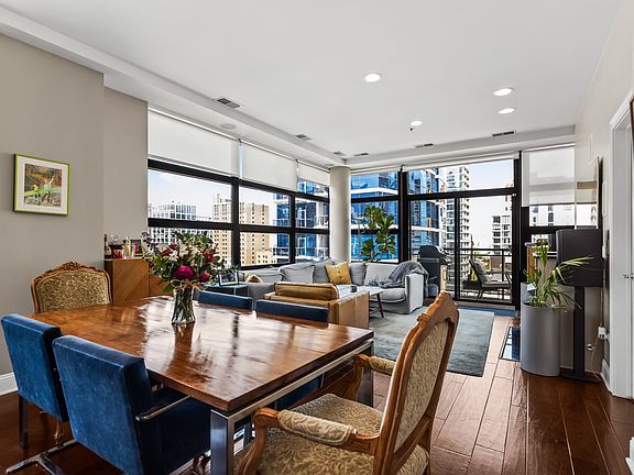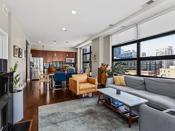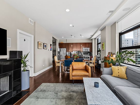 A rare find, this expansive 2-bed/2-bath home offers the largest layout in the building with space for a dining table, open kitchen with island, and a bright living area with cozy gas fireplace. High ceilings and a split floor plan provide both comfort and privacy. The primary suite fits a king bed and features a walk-in closet with built-ins, an additional closet, and a spa-like bath with walk-in shower, double vanity, and large linen closet. The second full bath includes a tub. Updates in 2024 include a top-of-the-line KitchenAid dishwasher, new furnace, and new AC-both with warranties. Parking with bike rack, storage unit, package room, and door staff 7 days a week until 11pm complete the offering. Move right in and enjoy!