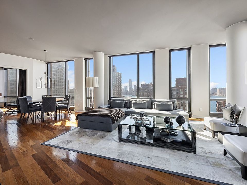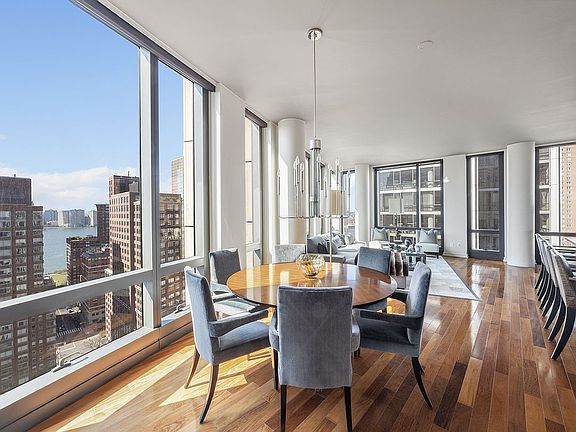 Stunning sunset and Hudson River views fill this expansive 2,366-square-foot corner residence at 101 Warren Street. With coveted northwestern exposure, this 3-bedroom, 3.5-bath home is bathed in natural light from its 10-foot ceilings, floor-to-ceiling windows, and striking limestone façade framing.