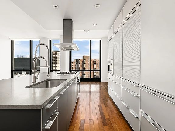A generous living room lined with wall of glass affords a perfect backdrop for entertaining. Lounge and dine with guests while savoring the views, and enjoy meals prepared in the fabulous chef's kitchen appointed with custom cabinetry by Bulthaup, and high-end appliances by Miele and Subzero. Two spacious bedroom suites on the opposite side of the home are highlighted by city and river views and the primary retreat with an oversized walk-in closet and deluxe marble spa bath for the ultimate pampering.