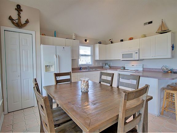 "My 4 Beaches" is a three bedroom, two bath beach cottage just a short stroll to both the beach and sound. Enter into the large, open great room from the screened front porch. The fully stocked kitchen, located to your left, boasts a dining area featuring seating for six at the table. Bar style seating is also available in the kitchen adding three additional spots.
