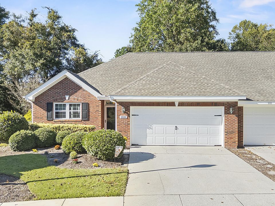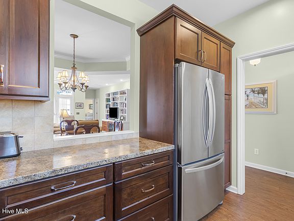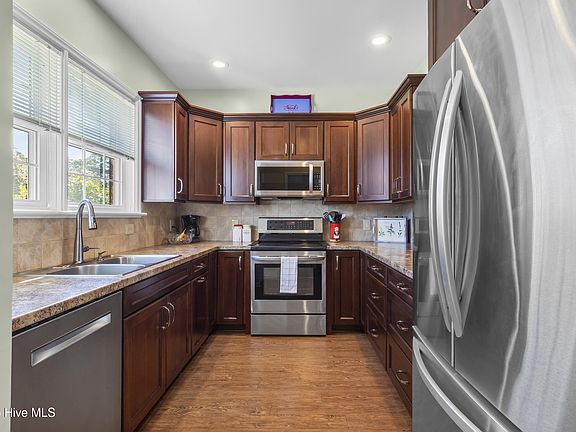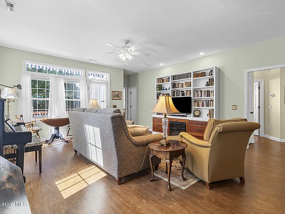 Enjoy low-maintenance living and thoughtful upgrades in this beautifully maintained 2-bedroom, 2-bath end-unit brick townhome offering over 1,200 square feet of comfortable style. As an end unit, this home is filled with abundant natural light, highlighting the 9-foot ceilings and LVP/LVT flooring throughout (no carpet!). The kitchen shines with 42-inch cherry wood soft-close cabinets and drawers, a tile backsplash, stainless steel appliances, and plenty of storage, while the living room features custom built-ins that add warmth and character, with a sleek electric fireplace. The primary suite includes dual walk-in closets and a custom floating vanity, creating a modern, spa-like retreat. Enjoy peace of mind with a new HVAC and full duct system, energy-efficient Ecoview double-hung windows, and a UV light anti-mold air scrubber in the attic. Sound-attenuating drywall between units ensures quiet comfort, and the large patio with a retractable awning offers the perfect spot to relax in the shade while overlooking the serene wooded backdrop. HOA covers lawn care, and the neighborhood features sidewalks on both sides and a prime location—walking distance to Halyburton Park, just 5 minutes from The Pointe at Barclay, 19 minutes to Wrightsville Beach, and 17 minutes to Carolina Beach. Complete with a two-car garage, this home perfectly blends comfort, quality, and convenience.